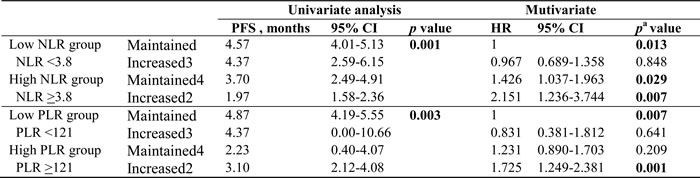 Table 7: PFS analysis of NLR and PLR with co-analysis of dynamics of NLR and PLR during chemotherapy.