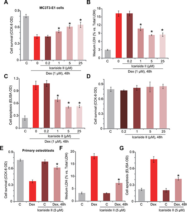 Figure 1: Icariside II protects osteoblasts from Dex. MC3T3-E1 osteoblastic cells (A–D) or the primary murine osteoblasts (E–G) were treated with dexamethasone (“Dex”, 1 μM) and/or indicated concentration of icariside II (0.2–25 μM), cells were then cultured in conditional medium for 48 hours; Cell survival was tested by the CCK-8 assay (A, D and E); Cell death was examined by the LDH release assay (B and F); Cell apoptosis was tested by the Histone DNA ELISA assay (C and G). Data are shown as mean (n = 5) ± standard deviation (SD) (Same for all figures). “C” stands for untreated control (Same for all figures). Experiments in this figure were repeated for a total of five times, and similar results were obtained each time. *P < 0.05 vs. Dex only group.