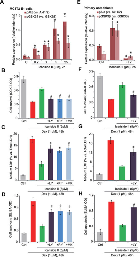 Figure 2: Akt activation is required for icariside II-induced osteoblast cytoprotection against Dex. Expressions of Akt and GSK3β (phosphorylated and regular) in MC3T3-E1 osteoblastic cells and primary murine osteoblasts with designated treatment were tested by Western blot assay, and results of three repeats were quantified (A and E). MC3T3-E1 osteoblastic cells (B–D) or primary murine osteoblasts (F–H) were pre-treated for 30 min with listed Akt inhibitor: LY294002 (“+LY”, 500 nM), MK-2206 (“+MK”, 5 μM) or perifosine (“+Prf” , 5 μM), followed by icariside II (5 μM) and dexamethasone (“Dex”, 1 μM) treatment, cells were then cultured in conditional medium for 48 hours; Cell survival was tested by the CCK-8 assay (B and F); Cell death was examined by the LDH release assay (C and G); Cell apoptosis was tested by the Histone DNA ELISA assay (D and H). Experiments in this figure were repeated for three times, and similar results were obtained each time. *P < 0.05 vs. “C” group. #P < 0.05 vs. icariside II only group.