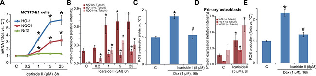 Figure 3: Icariside II activates Nrf2 signaling and inhibits Dex-induced ROS production. MC3T3-E1 osteoblastic cells (A–C) or the primary murine osteoblasts (D–E) were treated with indicated concentration of icariside II (0.2–25μM), or plus dexamethasone (“Dex”, 1 μM), cells were cultured in the conditional medium for indicated time; mRNA (A) and protein (B and D, results of three repeats were quantified) expression of listed genes were shown; Relative ROS intensity was tested by the DCFH-DA fluorescent assay (C and E). Experiments in this figure were repeated for a total of three times, and similar results were obtained each time. *P < 0.05 vs. “C” group. #P < 0.05 vs. Dex only group.