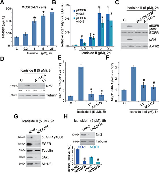 Figure 5: EGFR trans-activation mediates icariside II-induced Akt and Nrf2 activation in osteoblasts. MC3T3-E1 cells were treated with indicated concentration of icariside II (0.2–25 μM), cells were then cultured for indicated time; HB-EGF content in the conditional medium was evaluated by the ELISA assay (A); Expression of listed proteins was tested by the Western blot assay (B, results of three repeats were quantified). MC3T3-E1 cells, pretreated for 30 min with anti-HB-EGF (100 μg/mL), AG1478 (500 nM) or LY294001 (“LY”, 500 nM), were treated with icariside II (5 μM), cells were further cultured for designated time; Expression of listed proteins was shown (C and D); mRNA expression of HO-1 (E) and NQO1 (F) was also tested. Puromycin-selected MC3T3-E1 cells, expressing non-sense control shRNA (“shNC”) or EGFR shRNA (“shEGFR”), were treated with icariside II (5 μM) for indicated time; Protein or mRNA expression of listed genes were shown (G and H). Experiments in this figure were repeated for three times, and similar results were obtained each time. *P < 0.05 vs. “C” group. #P < 0.05 vs. icariside II only group.