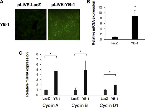 Figure 2: YB-1 induced proliferation genes in mice. (A) Overexpression of YB-1 in hepatocytes of mice by hydrodynamic gene delivery. Hepatocyte specific expression vector (pLIVE-YB-1) and the control vector (pLIVE-LacZ) were force-expressed in the liver of 6 weeks old mice by hydrodynamic gene delivery method. After 48 hours, the mice livers were stained with YB-1 antibody. (B, C) Proliferation genes were upregulated in YB-1 overexpressed liver. Relative expression of YB-1and cell cycle related genes in mice liver (n = 3) were analyzed by real-time PCR. Expression levels were normalized to that of GAPDH. Each bar represents the means of three determinations ± SD. *p < 0.05 and **p < 0.01 among the indicated groups.