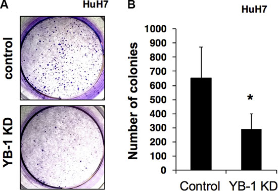 Figure 3: YB-1 KD HCC cells reduced colony formation ability. (A) The control and YB-1 KD clones of HuH7 cells were seeded at low density in individual wells of a standard 6-well plate and grew for 14 days in 3% FBS DMEM. Colonies were visualized by crystal violet staining (A) and the numbers of colonies were counted (B). The ability of colony formation was significantly lower in the YB-1 KD cells group compared with control cells. Each bar represents the means of three determinations ± SD. *p < 0.05 among the indicated groups.