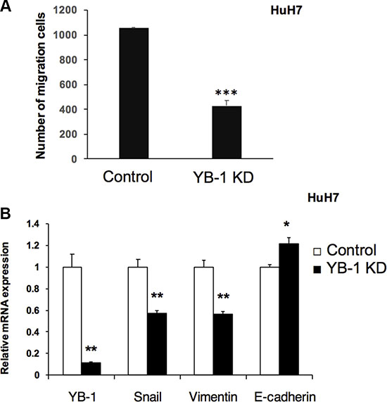 Figure 4: YB-1 Knockdown HCC cells decreased migration ability. (A) Knock-down YB-1 inhibited migration ability of HuH7 cell. Cell migration was determined using Millipore Transwell chambers. The numbers of cells in five random microscopic fields were counted for each group. Data shown represent the means ± standard errors of the means (SEM) of data from at least 3 independent experiments. (B) EMT related genes were down-regulated in YB-1 knock-down HCC cells. The expression of snail and vimentin, the mesenchymal related genes, were down-regulated, and E-cadherin, an epithelial related gene, was up-regulated in YB-1 knock-down HuH7 cells. Expression levels were normalized to that of GAPDH. Each bar represents the means of three determinations ± SD. *p < 0.05, **p < 0.01 and ***p < 0.001 among the indicated groups.