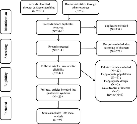 The literature screening process to select studies for our meta-analysis is depicted in Figure 1. A total of 768 references were retrieved from the literature searches, of which 154 records were excluded as duplicates using the “find duplicates” feature of Endnote X7. Further, 572 articles were excluded after screening the titles and abstracts of the references. When the remaining 42 full-text articles were evaluated for eligibility, 20 manuscripts corresponding to 9 studies met the eligibility criteria and were included for our analysis(Lukka2005 [12]; Yeoh 2003, 2006, 2011 [13–15]; Norkus2005, 2009 [16–18]; Arcangeli2009, 2012 [19–21]; Dearnaley2012, 2015, 2016 [22–24]; Hoffman2014 [25]; Pollack2006, 2013 [26, 27]; Aluwini2015, 2016 [28–30]; Lee2016 [31]) (Table 1).