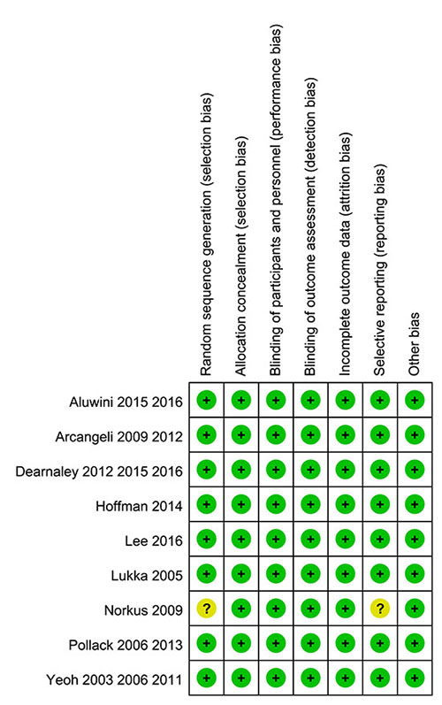 Each of the nine RCTs with 5969 patients that were included in this meta-analysis underwent quality evaluation based on the Handbook of Cochrane for Systematic Reviews of Interventions: “random” was mentioned in all the studies, all the RCTs reported the basic features of patients, and approaches of allocation concealment were reported in all the trails. However, one of the studies did not describe the method of randomized sequence generation and their reasons for incomplete outcome data was interpreted as selective report bias [16–18]. The qualities of the assessed trials in the meta-analysis are shown in Figure 2.