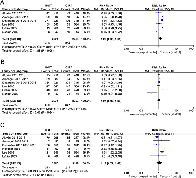 Six trials with a total of 4529 patients that reported grade 2–4 acute GU toxicity results were included in the meta-analysis. The random-effect model was used due to considerable heterogeneity (Tau² = 0.03; Chi² = 12.99, P = 0.02; I² = 62%). We found that the grade 2–4 acute GU toxicity was not significantly increased by H-RT in comparison to C-RT (RR = 1.04, 95% CI: 0.87–1.25; P = 0.64; Figure 5B).