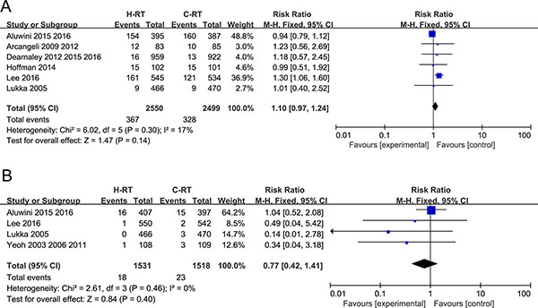 The outcomes of local recurrence were reported in 4 studies. Our analysis showed that there was no significant benefit for the H-RT group in comparison to the C-RT group (RR = 0.77, 95% CI: 0.41–1.45, P =0.42) and they showed a low-level of heterogeneity (P = 0.33, I² = 12%; Figure 4B).