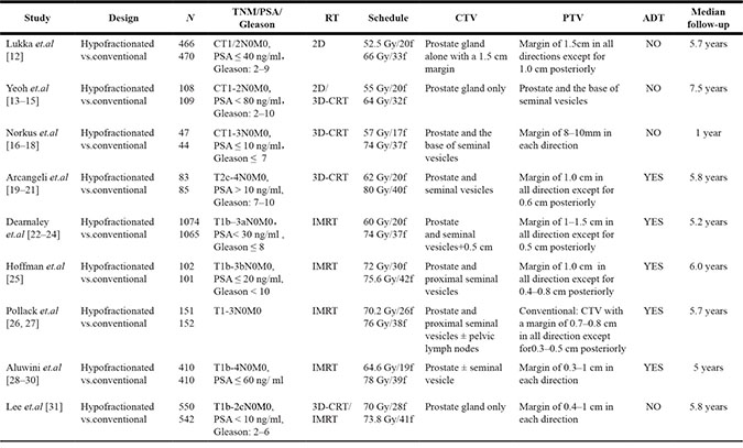 Abbreviations: RT: radiotherapy; vs.: versus; 2D:two-dimensional; 3D-CRT: three-dimensional conformal radiotherapy; ADT: androgen deprivation therapy; IMRT: intensitymodulated radiation therapy; TNM: tumor node metastasis; PSA: prostate-specific androgen; f: fraction.