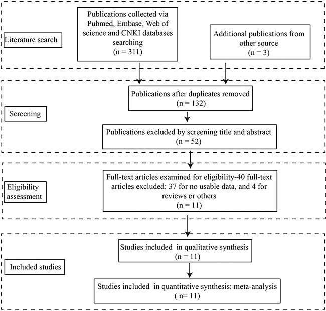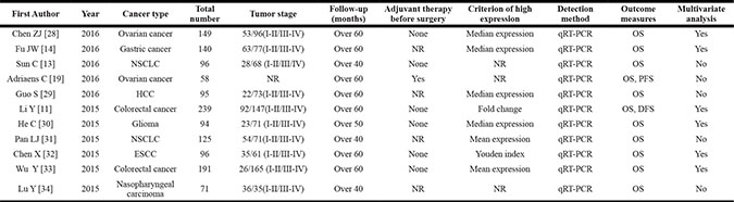 The detailed procedures of literature retrieval were shown in Figure 1. A total of 11 studies were finally identified. The total number of patients included in the present meta-analysis was 1354, and the patient sample size ranges from 71 to 239 with a mean value of 96.0. Ten included studies were conducted in China, and one study was conducted in foreign countries. There are 8 type of cancers in the included studies, with two studies for ovarian cancer, two studies for colorectal cancer, two studies for NSCLC, one study for glioma, one study for nasopharyngeal carcinoma, one study for esophageal squamous cell carcinoma (ESCC), one study for hepatocellular carcinoma (HCC). All the clinical specimens were preserved before RNA extraction, and main information of the included studies were shown in Table 1.