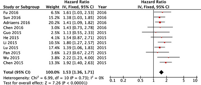 We first analyzed the association between NEAT1 expression levels and OS in the 11 included studies. The fixed-effects model was applied to estimate the pooled hazard ratios (HRs) and the respective 95% confidence interval (CI). As show in Figure 2, there was no heterogeneity across these included studies (Ph = 0.73, I2 = 0%). The HR of the high NEAT1 expression level group versus the low NEAT1 expression level group was 1.53 (95% CI = 1.36–1.71, P < 0.001, Figure 2). The results suggest that there was significant difference in the OS between high NEAT1 expression level group and low NEAT1 expression level group. A significantly shorter OS was shown in the patients with high NEAT1 expression level than that with low NEAT1 expression level. Thus, it is implied that the increased expression level of NEAT1 was associated with poor OS.