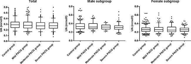 Moreover, Table 1 highlighted significant difference in UA between PACG and control groups. We found that the difference between men in PACG and control groups in UA levels was only 0.015. However, the difference between females and males was much higher: in the PACG group it was 0.067 (4-fold higher); in the control group it was 0.074 (5-fold higher). Recently, population-based surveys of glaucoma in Asians reported that the prevalence of PACG was higher in the female than male population [45, 46]. Cheng JW et al. [46] found that PACG affects women 1.51 times more frequently than men. Therefore, our hypothesis was that the much lower UA level might be the cause for the female to have a much higher risk of PACG.
