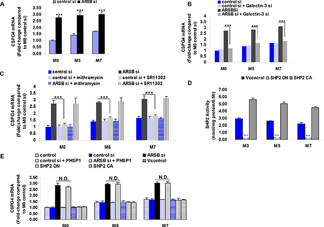 Figure 2: CSPG4 mRNA expression increases with decline in ARSB. (A) CSPG4 expression is regulated by effects of the ARSB – C4S – galectin-3 – Sp1 pathway and is greater in the more aggressive melanoma cell lines (M5 and M7 vs. M0) (p < 0.001; n = 5). The increase in CSPG4 expression is associated with the decline in ARSB activity and the increase in C4S. (B) The increase in CSPG4 expression was inhibited when galectin-3 was silenced by siRNA (p < 0.001; n = 3). (C) Mithramycin, an inhibitor of Sp1 binding to DNA, inhibited the effect of ARSB siRNA on CSPG4 expression (p < 0.001; n = 3). In contrast, SR11302, an inhibitor of c-fos binding to DNA and of AP-1 mediated transcriptional effects, did not block the effect of ARSB siRNA on CSPG4 expression. (D) SHP2 activity was significantly increased by transfection with the constitutively active DNA construct and significantly reduced by the dominant negative construct (p < 0.001; n = 3). (E) SHP2 inhibition, by either PHSP1 or by dominant negative SHP2 DNA construct, had no effect on CSPG4 expression (n = 3). Also, the constitutive activation of SHP2 had no effect on CSPG4 expression. [AP-1=activator protein 1; ARSB=arylsulfatase B; CA=constitutively active; CSPG4=chondroitin sulfate proteoglycan 4; DN=dominant negative; N.D.=no difference; PHSP1=phenylhydrazonopyrazolone sulfonate; SHP2=tyrosine-protein phosphatase non-receptor type 11 (PTPN11); si=siRNA=small interfering RNA; Sp1=specificity protein 1; Vcontrol=vector control].