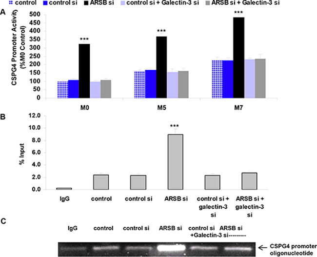 Figure 3: CSPG4 promoter activation increased following ARSB knockdown. (A) CSPG4 promoter activation was least in the normal melanocytes (M0), compared to the radial growth phase melanoma (M5) or metastatic melanoma (M7) cells. ARSB silencing increased the luciferase activity, and galectin-3 silencing inhibited the promoter activation (p < 0.001, n = 5). (B) Chromatin immunoprecipitation (ChIP) using an Sp1 antibody and following ARSB silencing showed increased binding to the CSPG4 promoter region, which encompassed an Sp1 binding site. Galectin-3 silencing inhibited the ARSB-silencing induced increase (p < 0.001; n = 3). (C) Blot shows increased density of the Sp1 binding to the CSPG4 promoter following ARSB silencing. The blot shows reduced density following galectin-3 silencing. [ARSB=arylsulfatase B; ChIP=chromatin immunoprecipitation; CSPG4=chondroitin sulfate proteoglycan 4; si=siRNA=small interfering RNA; Sp1=Specificity protein 1].