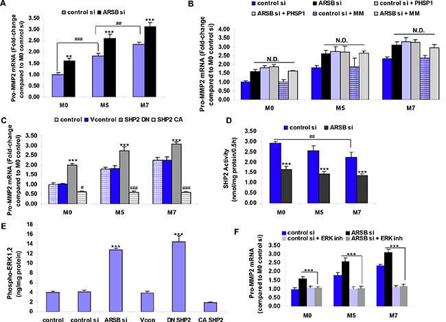 Figure 4: Increase in pro-MMP2 mRNA expression following ARSB silencing is mediated by SHP2 and by phospho-ERK1,2. (A) Pro-MMP2 expression increased when ARSB was silenced in the M0, M5, and M7 cells (*** for p < 0.001, ** for p < 0.01; n = 5). Baseline pro-MMP2 expression was significantly greater in the M5 and M7 cells than in the M0 cells (### for p < 0.001, ## for p < 0.01; n = 5). (B) Exposure to mithramycin (MM) did not inhibit the ARSB-induced increased in pro-MMP2 expression. The SHP2 inhibitor PHSP1 also increased the pro-MMP2 expression, and the combination of ARSB silencing and PHSP1 did not further increase the pro-MMP2 mRNA expression. (C) Pro-MMP2 expression increased following transfection by the dominant negative SHP2 DNA construct and declined from baseline following transfection by the constitutively active SHP2 construct (*** for p < 0.001, ### for p < 0.001, # for p < 0.05; n = 5). (D) ARSB silencing reduced the SHP2 activity in the M0, M5, and M7 cell lines (*** for p < 0.001; n = 3). The M0 control si level of SHP2 activity was significantly higher than in the control si M7 cells (## for p < 0.01; n = 3). (E) Phospho-ERK1,2 was markedly increased following ARSB silencing and transfection by the DN SHP2 construct in the M0 cells (p < 0.001; n = 3). (F) Pro-MMP2 expression was significantly reduced following exposure to an ERK inhibitor (ERK activation inhibitor peptide 1) (p < 0.001; n = 5). [ARSB=arylsulfatase B; CA=constitutively active; CSPG4=chondroitin sulfate proteoglycan 4; DN=dominant negative; ERK=extracellular signal-regulated kinase; MMP=matrix metalloproteinase; inh=inhibitor; MM=mithramycin; N.D.=no difference; PHSP1= phenylhydrazonopyrazolone sulfonate; SHP2= tyrosine-protein phosphatase non-receptor type 11 (PTPN11); si=siRNA=small interfering RNA; Vcon=vector control].