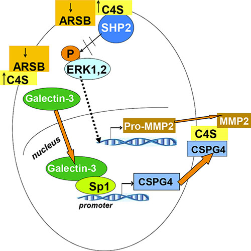 This report addresses the mechanism by which increased mRNA expression of CSPG4 and MMP2 occur following decline in the enzyme arylsulfatase B (ARSB; N-acetylgalactosamine 4-sulfatase). ARSB acts to remove 4-sulfate groups from the non-reducing end of chondroitin 4-sulfate (C4S) or dermatan sulfate (DS), and thereby initiates their degradation [9–11]. Previous work has shown that decline in ARSB and the resulting increase in chondroitin 4-sulfation were associated with transcriptional effects mediated by galectin-3 or by the ubiquitous non-receptor tyrosine phosphatase SHP2 [12–17]. Reduced binding of galectin-3 to the more highly sulfated C4S present when ARSB activity is less, leads to promoter activation due to interaction of galectin-3 with AP-1 (Activator protein-1) or Sp1 (Specificity protein 1). Increased expression of versican in human prostate epithelial and stromal cells, hypoxia inducible factor 1-alpha (HIF 1-α) in human colonic and bronchial epithelial cells, and Wnt9A (Wingless-Type MMTV Integration Site Family, Member 9A) in human colonic epithelial cells were reported.