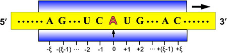 denotes the single nucleic acid code A (adenine), the subscript ξ is an integer, N– ξ represents the ξ-th upstream nucleotide from the center, the N+ ξ the ξ-th downstream nucleotide, and so forth. The (2ξ + 1)-tuple RNA sample