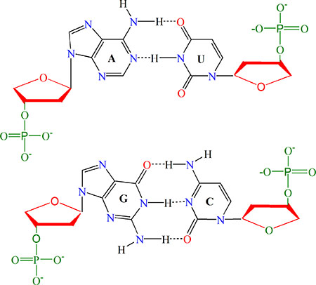 Figure 3: Illustration to show the structure of paired nucleic acid residues. The upper panel is the A-U pair bonded to each other with two hydrogen bonds; the lower panel is the G-C pair with three hydrogen bonds. It can also be seen from the figure that A and G have two rings, while C and U have one ring. Also, according to chemical functionality, A and C can be classified into the amino group, while G and U into the keto group. See the main text for further explanation.