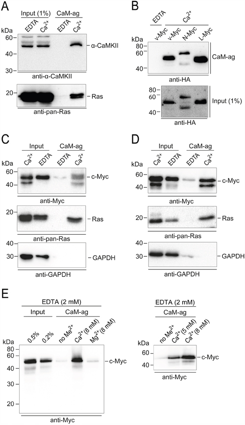 Figure 4: PPI of CaM and Myc family members. Whole cell extracts of distinct cell lines and tissues were used in CaM-agarose (CaM-ag) pull-down experiments. A. For comparison, authentic CaM binding partners were analyzed first. Endogenous CaM-dependent protein kinase from whole mouse brain extracts was detected using monoclonal antibodies directed against α-CAMKII. Ras proteins were analyzed in extracts from the human colon adenocarcinoma cell line SW480 using monoclonal anti-pan-Ras antibodies. B. To analyze the binding of distinct Myc-family members to CaM, HA-tagged v-Myc, N-Myc, and L-Myc proteins were overexpressed in QT6 cells. Whole cell extracts were prepared and subjected to CaM-ag binding assays. Proteins eluted from the affinity matrix (upper panel) and aliquots of whole cell extracts (lower panel) were analyzed by immunoblotting using HA-specific antibodies. C. Endogenous c-Myc proteins were analyzed in CaM-ag binding assays using extracts from SW480 cells and monoclonal anti-c-Myc antibodies. For direct comparison, Ras proteins were analyzed from the same extracts using monoclonal anti-pan-Ras antibodies. GAPDH was used as a negative control, using monoclonal anti-GAPDH antibodies. Input: 0.25% (Ca2+), or 0.1% (EDTA). D. Analyses as in (C) of endogenous c-Myc proteins from the human embryonic kidney cell line HEK293. All binding assays were done in the presence of 2 mM EDTA, or 0.5 mM CaCl2 (Ca2+). E. Left panel: CaM-ag binding analysis of endogenous c-Myc proteins from HEK293 cell extracts containing 2 mM EDTA and supplemented either with no metal ions (no Me2+), or an excess (8 mM) of Ca2+ or Mg2+, respectively. Right panel: Analysis as before with variation of the excess Ca2+ concentration.