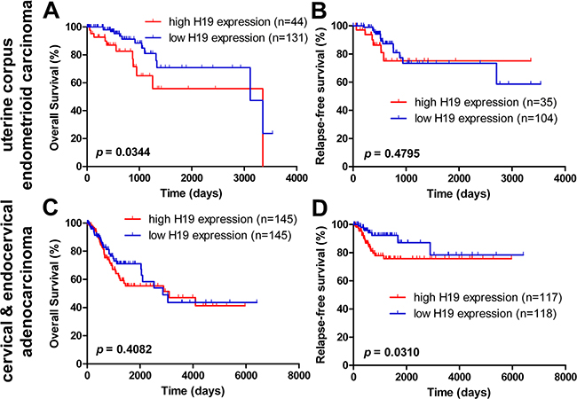 Female cancers, including cancers of the breast, uterus, ovary, and cervix, account for over 40% of newly diagnosed malignancies and for approximately 30% of malignancy-associated deaths in women worldwide [17], and have a relatively poor prognosis [34]. In order to assess the potential prognostic value of H19 expression in female cancers, we analyzed six datasets for female cancers from TCGA, and discovered that high expression of H19 had an unfavorable prognostic influence on OS and RFS in uterine corpus endometrioid cancer and cervical cancer, but not in breast cancer and ovarian cancer. Although there were no statistical differences between the two groups of higher and lower H19 expression in breast or ovarian cancer, there was an “HR >1” in almost all of our analyses of breast and ovarian cancer.