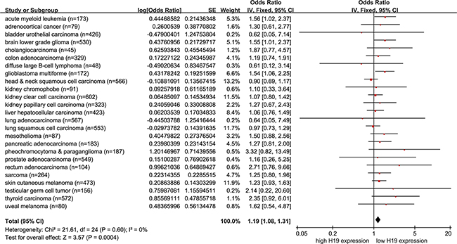Figure 3: Meta-analysis of HRs with 95%CI for overall survival from the univariate analysis of cancers from the available literature. The size of the blocks or diamonds represents the weight for the random-effect model in the meta-analysis. HR > 1 indicates that high H19 expression is correlated with a more unfavorable overall survival (OS).