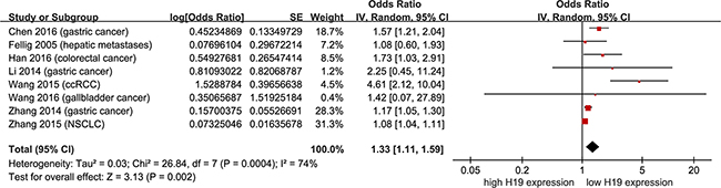 As shown in Figure 3, data were derived from univariate Cox analysis of 8 studies, totaling 615 non-female cancer patients. Under a random-effect model, non-female cancer patients with high H19 expression had shorter OS than those with low H19 expression (Figure 3; pooling HR = 1.33, 95 % CI = 1.11 - 1.59, p = 0.002). In addition, data were derived from multivariate Cox analysis of 5 studies, totaling 453 patients. With a random-effect model, shorter OS was observed in non-female cancer patients with high H19 expression than those with low H19 expression (Figure 4; pooling HR = 1.31, 95 % CI = 1.09 - 1.59, p = 0.004). These results suggested that high H19 expression could predict inferior clinical outcomes on OS time in non-female cancer patients.