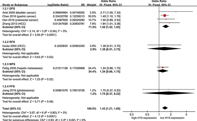 Figure 5: Meta-analysis of HRs with 95%CI for DFS/RFS/MFS/PFS from the univariate analysis of cancers from the available literature. The size of the blocks or diamonds represents the weight for the random-effect model in the meta-analysis. HR > 1 indicates that high H19 expression is correlated with a more unfavorable disease-free survival (DFS), relapse-free survival (RFS), metastasis-free survival (MFS) and progression-free survival (PFS).
