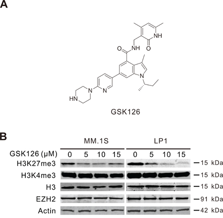 Figure 1: GSK126 inhibits cellular EZH2 methyltransferase activity in multiple myeloma (MM) cells. A. Chemical structure of GSK126. B. MM.1S and LP1 cells were treated with increasing concentrations of GSK126 for 72 h, the whole cell lysates were subjected to immunoblotting for analysis of EZH2, H3K27me3, H3K4me3 and H3.