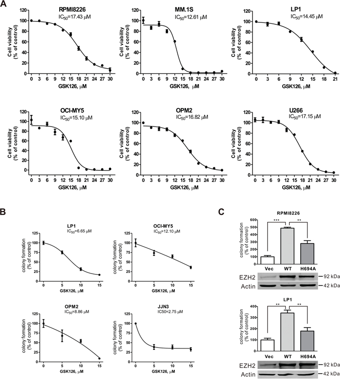 Figure 2: GSK126 inhibits growth of multiple myeloma cells. A. MM cells were incubated with increasing concentrations of GSK126 for 72 h. The cell viability was measured by MTS assay. Dose-response curves are shown. B. Clonogenicity of MM cells were evaluated with drug-free soft agar assay in the indicated lines of MM cells after 24 h of pre-treatment with the escalating concentrations of GSK126. Curves are plotted with mean ± SEM. C. The colony-formation ability of RPMI8226 and LP1 cells that were transfected with constructs empty vector, EZH2-WT, or EZH2-H694A was measured in soft-agar assay, and the overexpression of wild type and mutant EZH2 was examined by immunoblotting. **, P < 0.01; ***, P < 0.0001, one-way ANOVA with post hoc intergroup comparison by the Tukey’s test.