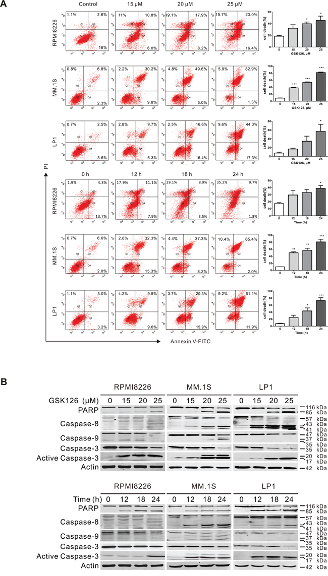Figure 3: GSK126 induces apoptosis in multiple myeloma cells. A. RPMI8226, MM.1S and LP1 cells were exposed to increasing concentrations of GSK126 for 24 h, or to 25 μM GSK126 for different time, and the apoptotic cells were analyzed by flow cytometry after dual-staining with Annexin V and propidium iodide (PI). Left, representative flow cytometry dot plots; Right, statistical analysis of 3 independent experiments. Dead cells were the sum of cells with single- or dual-stained by Annexin V or PI. *, P < 0.05; **, P < 0.01; ***, P < 0.0001, one-way ANOVA with post hoc intergroup comparison by the Tukey’s test. B. Immunoblotting analysis was conducted for PARP, Caspase-8, -9 -3 and active-caspase-3 in RPMI8226, MM.1S and LP1 cells treated with escalating concentrations of GSK126 for 24 h, or with 25 μM GSK126 for the indicated time.
