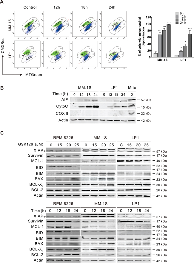 Figure 4: GSK126 triggers the mitochondrial pathway of apoptosis. A. MM.1S and LP1 cells were treated with 25 μM GSK126 for the time indicated, and the mitochondrial potential was then analyzed by flow cytometry after staining with CMXRos and MTGreen. Representative dot plots (left) and statistical analyses of 3 independent experiments (right) were shown. B. MM.1S and LP1 cells were treated with 25 μM GSK126 for the indicated durations before the cytosolic fractions were extracted with digitonin buffer. AIF and cytochrome c (Cyto C) in the cytosol fractionations were detected by immunoblotting. Cytochrome c oxidase subunit II (COX II) served an indicator of mitochondrial extracts (Mito). C. Dose- and time-dependent effects of GSK126 on apoptosis-related proteins in RPMI8226, MM.1S and LP1 cells were detected by immunoblotting. Arrows indicates the specific bands of corresponding proteins.