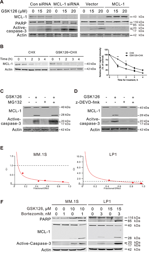 Figure 5: MCL-1 is critical for GSK126-induced apoptosis and involved in synergistic antitumor effect between GSK126 and bortezomib. A. MM.1S cells were transfected with MCL-1 expression plasmid or siRNA for 24 h, then treated with GSK126 at indicated concentrations for another 24 h. The whole cell lysates were subjected to immunoblotting with MCL-1, PARP and active-caspased-3 antibodies, respectively. B. MM.1S cells were treated with 25 μM GSK126 for 12 h, followed by treatment with cycloheximide (CHX, 100 μM) for another 0~4 h. Whole cell lysates were extracted for immunoblotting with anti-MCL-1 (left). Triplicate experiments were performed for statistical analysis (right). Quantification of the signal intensity was done in the Image Studio Lite software (LI-COR, Inc.). *, P < 0.05; **, P < 0.01, Student’s t test. C. MM.1S cells preincubated with MG132 (50 nM) for 1 h and then were treated with GSK126 (25 μM) for 12 h. The degradation of MCL-1 was analyzed by immunoblotting. D. Immunoblotting analysis was performed for the active-caspase-3 and cleavage of MCL-1 in MM.1S cells treated with z-DEVD-fmk (20 μM, 1 h) and following GSK126 (25 μM, 24 h). E. MM.1S and LP1 cells were treated with a serial constant-ratio combining GSK126 and bortezomib for 72 h. The cell viability-based synergistic effect of GSK126 and bortezomib was analyzed according to approach described by Chou and Talalay. The combination index (CI) smaller than 1 indicates a synergetic effect. F. MM.1S and LP1 cells were treated with GSK126 and bortezomib alone or in combination for 24 h and cell lysates were subjected to immunoblotting with anti-active caspase-3, anti-MCL-1 and anti-PARP.
