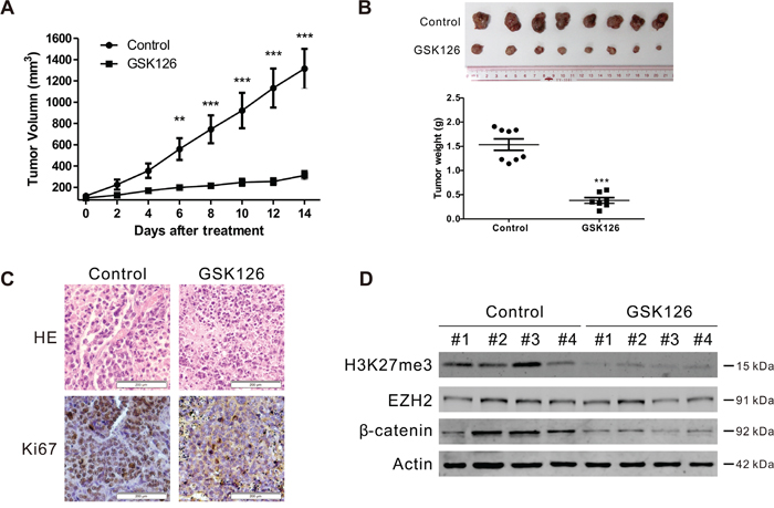 Figure 7: GSK126 abrogates the growth of RPMI8226 cells in subcutaneous xenografts of nude mice. A. The tumor growth curves were shown. Nude mice with RPMI8226 xenografts were treated with vehicle or GSK126 (200 mg/kg/day, i.p.) for ~14 days. **, P < 0.01; ***, P < 0.001, Student’s t test. B. Tumors dissected at the endpoints of the experiments were weighed and recorded. Shown are the photograph of the tumors (top) and the comparison of the tumor weight of the control and treated groups (bottom). ***, P < 0.001, Student’s t test. C. Hematoxylin and eosin (H&E)-staining and immunohistochemical analysis were performed for Ki67 in the xenograft tissues. D. Lysates of xenograft tissues from 4 representative mice of each group were subjected to immunoblotting with the indicated antibodies.