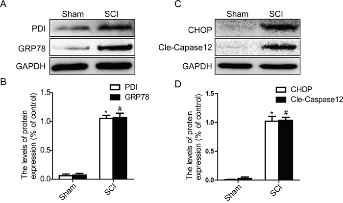Figure 1: Acute SCI leads to the activation of ER stress at the injury epicenter. A-D. Representative western blot and quantification data of ER stress markers GRP78, PDI, CHOP, and Cleaved-Caspase12 in the sham and SCI groups. *P< 0.01, #P< 0.01 vs sham group, n≥3.
