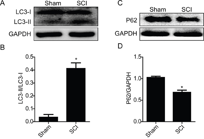 Figure 2: Acute SCI induces activation of autophagy. A and B. Representative western blot and quantification data of autophagy marker LC3-II in the sham and SCI groups. *P< 0.01 vs sham group, n≥3. C and D. Representative western blots and quantification data of autophagy marker P62 in the sham and SCI groups. *P< 0.05 vs sham group, n≥3.