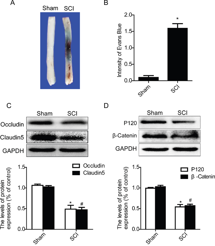Figure 3: Acute SCI leads to the disruption of BSCB and the loss of TJ and AJ proteins. BSCB permeability was measured at 1 d after SCI by using Evan’s Blue dye in sham and SCI group. A and B. Representative whole spinal cords and quantification of BSCB permeability data in each group showing Evan’s Blue dye permeabilized into spinal cord. *P< 0.01 vs sham group, n=4. C and D. Representative western blots and quantification data of TJ proteins (Occludin and Claudin5) and AJ proteins (β-catenin and P120) in the sham and SCI groups. *P< 0.01, #P< 0.01 vs sham group, n≥3.