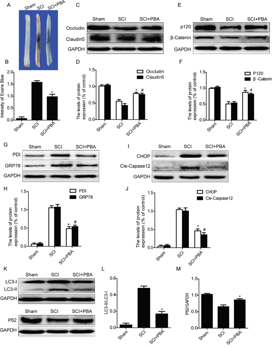 Figure 4: 4-PBA treatment ameliorates BSCB disruption and reduces activation of autophagy after SCI. A and B. Representative whole spinal cords and quantification of BSCB permeability data in each group showing Evan’s Blue dye permeabilized into spinal cord. *P< 0.01 vs SCI group, n=4. C-F. Representative western blots and quantification data of TJ proteins (Occludin and Claudin5) and AJ proteins (β-catenin and P120) in the sham, SCI and SCI+PBA groups. *P< 0.05, #P< 0.05 vs SCI group, n≥3. G-J. Representative western blots and quantification data of ER stress markers: GRP78, PDI, CHOP and Cleaved-Caspase12, in the sham, SCI and SCI+PBA groups, *P< 0.01, #P< 0.01 vs SCI group, n≥3. K-M. Representative western blots and quantification data of autophagy markers: LC3-II and P62, in the sham, SCI and SCI+PBA groups, *P< 0.05 vs SCI groups, n≥3.