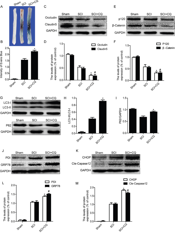 Figure 5: Inhibition of autophagy by chloroquine exacerbates BSCB disruption and ER stress after SCI. A and B. Representative whole spinal cords and quantification of BSCB permeability data in each group showing Evan’s Blue dye permeabilized into spinal cord. *P< 0.05 vs SCI groups, n=4. C-F. Representative western blots and quantification data of TJ proteins (Occludin and Claudin5) and AJ proteins (β-catenin and P120) in the sham, SCI and SCI+CQ groups. *P< 0.05, #P< 0.05 vs SCI group, n≥3. G-I. Representative western blots and quantification data of autophagy markers: LC3-II and P62, in the sham, SCI and SCI+CQ groups, *P<0.05 vs SCI group, n≥3. J-M. Representative western blots and quantification data of ER stress markers: GRP78, PDI, CHOP and Cleaved-Caspase12, in the sham, SCI and SCI+CQ groups, * P< 0.01, # P< 0.01 vs SCI group, n≥3.