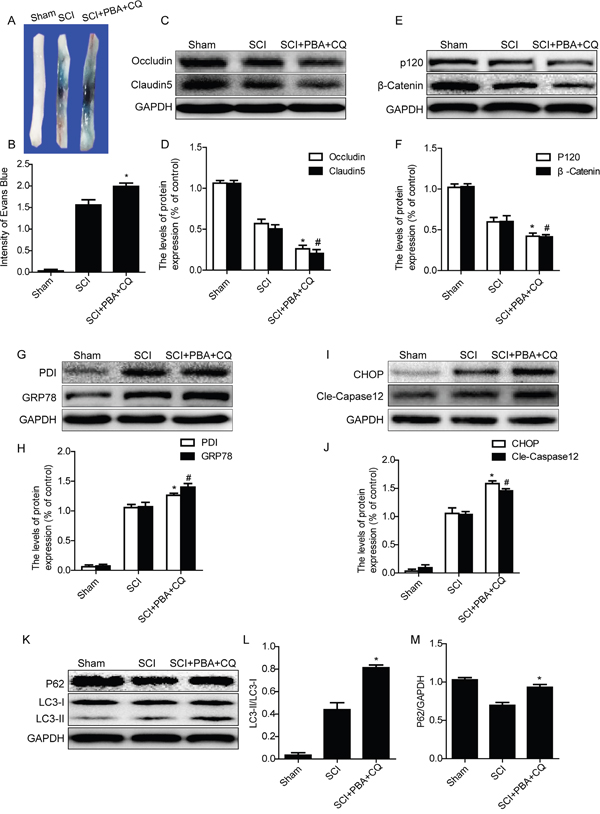 Figure 6: Chloroquine treatment abolishes the BSCB protective effect of PBA by exacerbating ER stress after SCI. A and B. Representative whole spinal cords and quantification of BSCB permeability data in each group showing Evan’s Blue dye permeabilized into spinal cord. *P< 0.05 vs SCI groups, n=4. C-F. Representative western blots and quantification data of TJ proteins (Occludin and Claudin5) and AJ proteins (β-catenin and P120) in the sham, SCI and SCI+PBA+CQ groups. *P< 0.05, #P< 0.05 vs SCI group, n≥3. G-J. Representative western blots and quantification data of ER stress markers: GRP78, PDI, CHOP and Cleaved-Caspase12, in the sham, SCI and SCI+PBA+CQ groups, *P< 0.05, #P< 0.05 vs SCI group, n≥3. K-M. Representative western blots and quantification data of autophagy markers: LC3-II and P62, in the sham, SCI and SCI+PBA+CQ groups, *P< 0.05 vs SCI group, n≥3.