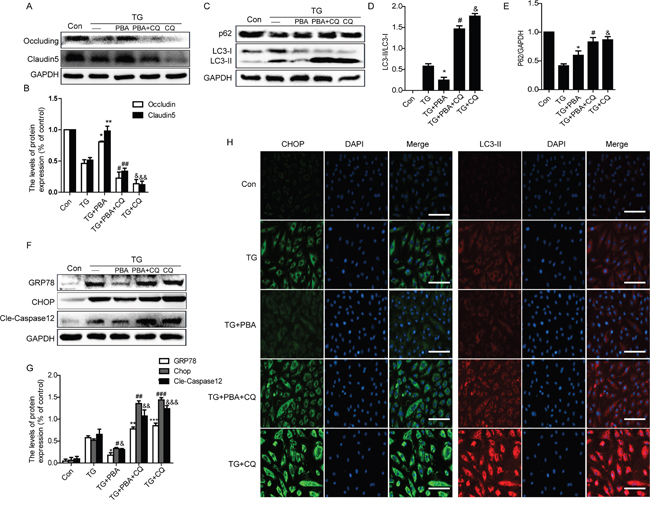 Furthermore, compared with the TG-only group cells, the expression levels of LC3-II expression was decreased in TG+PBA group but significantly increased both in TG+PBA+CQ and TG+CQ group cells (Figure 7C and 7D). However, the expression level of P62 was significantly decreased in TG-only group cells, and this decrease was partly inhibited in 4-PBA group (Figure 7C and 7E). Compared with the TG-only group, the expression levels of P62 were significantly increased in TG+PBA+CQ and TG+CQ group. Moreover, we also detect the expression of ER stress-associated protein and observed that 4-PBA treatment ameliorated TG-induced GRP78, CHOP and cleaved-Caspase12 expression, which was abolished by chloroquine treatment (Figure 7F and 7G). Double labelling immunofluorescence of CHOP and LC3-II results were consistent with the western blot results (Figure 7H). These data suggest that the 4-PBA treatment remits the role of ER stress on TJ proteins expression in HBMVEC, which was abolished by treating with chloroquine.