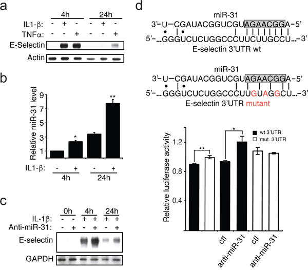Figure 1: IL-1β induces the expression of miR-31, which affects E-selectin abundance. a. The monolayer of HUVEC endothelial cells was treated with IL-1β (20ng/ml) or TNFα (10ng/ml) for indicated hours. Western blotting monitored the expression of E-selectin and Actin used as loading control. b. The miR-31 level was measured by quantitative reverse transcription-PCR and the snRNA U6 was used as the normalization control. c. Endothelial cells were transfected with 30nM of either anti-miR-31 (+) or corresponding inhibitor negative control (-) before the addition of IL-1β. The Western blots shown are representative of three independent experiments. The endogenous GAPDH was used as loading control. d. Top: The representation of miR-31 base-pairing with either E-selectin wild-type (wt) or mutated (mut) 3’ UTR sequence. The nucleotides in the gray box represent the seed region of miR-31, region important for target interaction. Bottom: E-selectin 3’UTR mediated reporter assays. Vector expressing luciferase reporter under the regulation of either wild-type (black bars) or mutated (white bars) E-selectin 3’UTR were transfected into HEK293T cells. 48 hours after transfection, relative luciferase activities were measured. Another set of reporters transfected cells were also transfected with 30nM of either anti-miR-31 or corresponding inhibitor negative control (ctl) to further test the contribution of miR-31 in E-selectin regulation. The error bars shown in panel b and d represent standard errors of three and six independent experiments, respectively. The significance was analyzed using a Student’s t-test (*p <0.05; **p<0.01).