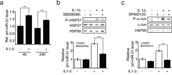 Figure 2: IL-1β induces the transcription of miR-31 via p38 and JNK. a. The pri-miR-31 levels were measured relative to GAPDH mRNA using quantitative reverse transcription-PCR (qRT-PCR). b-c. HUVEC endothelial cells were pre-treated with 5μM of p38 inhibitor SB203580 or 10μM of JNK inhibitor SP600125 for 1 hour before the addition of IL-1β (20ng/ml). The inhibitions were confirmed by Western blotting showing decreased of phospho-HSP27 (P~HSP27) and phospho-c-Jun (P~c-Jun), downstream of p38 and JNK, respectively. The endogenous HSP90 was used as loading control. Pri-miR-31 levels relative to GAPDH mRNA were determined by qRT-PCR. The Western blots are representative of four independent experiments. The error bars represent standard errors of four independent experiments and significance was analyzed using a Student’s t-test (*p <0.05; **p<0.01).