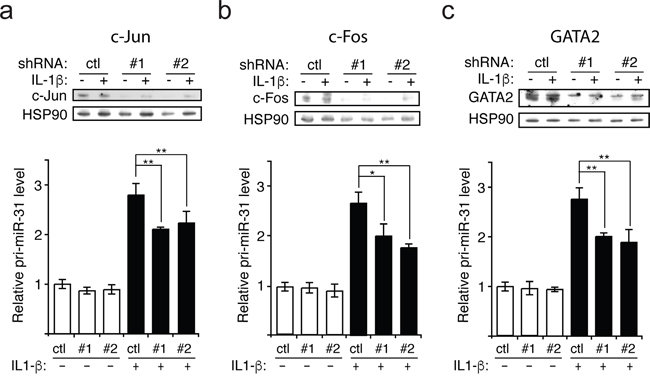 Figure 3: IL-1β induces the transcription of miR-31 via c-Jun, c-Fos and GATA2. a-c. Upon knockdown with lentivirus expressing either control (scramble shRNA) or two different shRNAs (#1 and #2) targeting each transcription factor (c-Jun, c-Fos and GATA2), the level of primary miR-31 (pri-miR-31) transcript relative to GAPDH mRNA (control) was determined by qRT-PCR. The knockdowns for each transcription factor were validated by Western blotting and HSP90 was probed and used as loading control. The Western blots are representative of three independent experiments. The error bars represent standard errors of three independent experiments and significance was analyzed using a Student’s t-test (*p <0.05; **p<0.01).