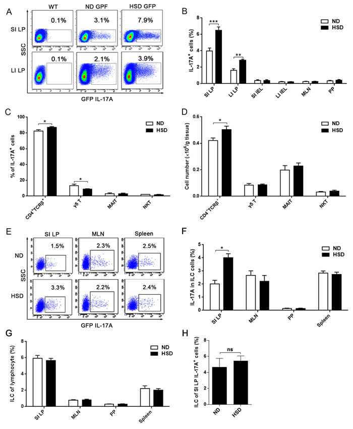 Figure 1: HSD stimulates IL-17A producing cells in intestinal lamina propria (LP). We isolated lymphocytes from small intestinal LP (SI LP), large intestinal LP (LI LP), small intestinal intraepithelial (SI IEL), large intestinal intraepithelial (LI IEL), mesenteric lymph node (MLN), and Peyer’s patch (PP), the mice include ND WT mice and IL-17A-GFP mice that accept 3 weeks ND or HSD. Immediately following isolation, cells were incubated for 4 hr with PMA/Ionomycin and GolgiPlug, and analyzed by flow cytometry. A. Representative flow cytometric scatterplot of GFP IL-17A+ cells in the SI LP and LI LP, data were gated on lymphocytes. B. The proportion of GFP IL-17A+ cells within the lymphocytes obtained from different locations (n = 8). C. After gated on the SI LP IL-17A+ cell, the cell fraction of CD4+TCRβ+ cells, γδ T cells, MAIT cells and NKT cells was measured (n = 8). D. The absolute number of CD4+TCRβ+ cells, γδ T, MAIT and NKT cells of the SI LP, data were acquired by flow cytometry and is expressed as cell number per gram of the small intestine (n = 8). E. The representative flow cytometric scatterplot of GFP IL-17A production of ILCs (lineage-CD45+CD90.2+) from the SI LP, MLN and spleen cells, the gated program was showed in Supplementary Figure 2. F. Summative histogram of GFP IL-17A expression in ILCs (n = 6). G. The percentages of ILCs in the lymphocytes from SI LP, MLN, PP and spleen (n = 6). H. Of IL-17A producing cells, the percentage of ILCs in the SI LP was analyzed (n = 6). Data are expressed as mean ± SEM from three independent experiments.