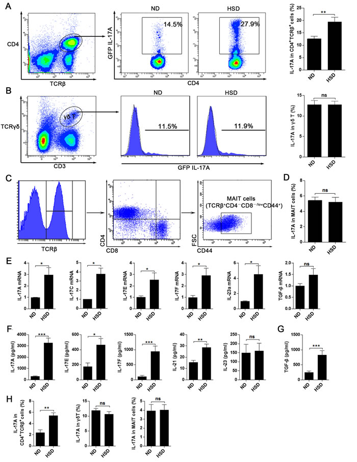 Figure 2: HSD leads to an increased Th17 response in intestinal lamina propria. A.-D. Fresh isolated SI LP lymphocytes from specified diet (3 weeks) mice were incubated for 4 hr with PMA/Ionomycin and GolgiPlug, and intracellular GFP IL-17A expression was evaluated by flow cytometry. A, proportion of IL-17A+ cells within the CD4+TCRβ+ SI LP lymphocytes from specified diet IL-17A-GFP mice (n = 8). B, proportion of IL-17A+ cells within the SI LP γδ T cells (n = 6), filled flow cytometric histograms represent the IL-17A-GFP mice and the dashed line histograms represent the WT mice. C, the flow cytometric gated program of the MAIT cells. D, proportion of IL-17A+ cells within the SI LP MAIT cells (n = 6). E. the mRNA expression of IL-17A, IL-17C, IL-17E, IL-17F, IL-23a and TGF-β, data were acquired from the fresh isolated SI LP cell from the mice exposed to 3 weeks of ND or HSD (n = 8). F.-G. comparison of the IL-17A, IL-17E, IL-17F, IL-21, IL-23 and TGF-β secreting levels of the SI LP cells from the mice exposed to 3 weeks of ND or HSD, fresh isolated SI LP cells were cultured in vitro with the stimulation of PMA and Con A for 12hr, than the supernatant were collected and analyzed (n = 8). H. fresh isolated LI LP lymphocytes from specified diet (3 weeks) mice were incubated for 4 hr with PMA/Ionomycin and GolgiPlug, and intracellular GFP IL-17A expression of CD4+TCRβ+ cells, γδ T cells and MAIT cells were evaluated by flow cytometry (n = 6). Data are expressed as mean ± SEM from three independent experiments.