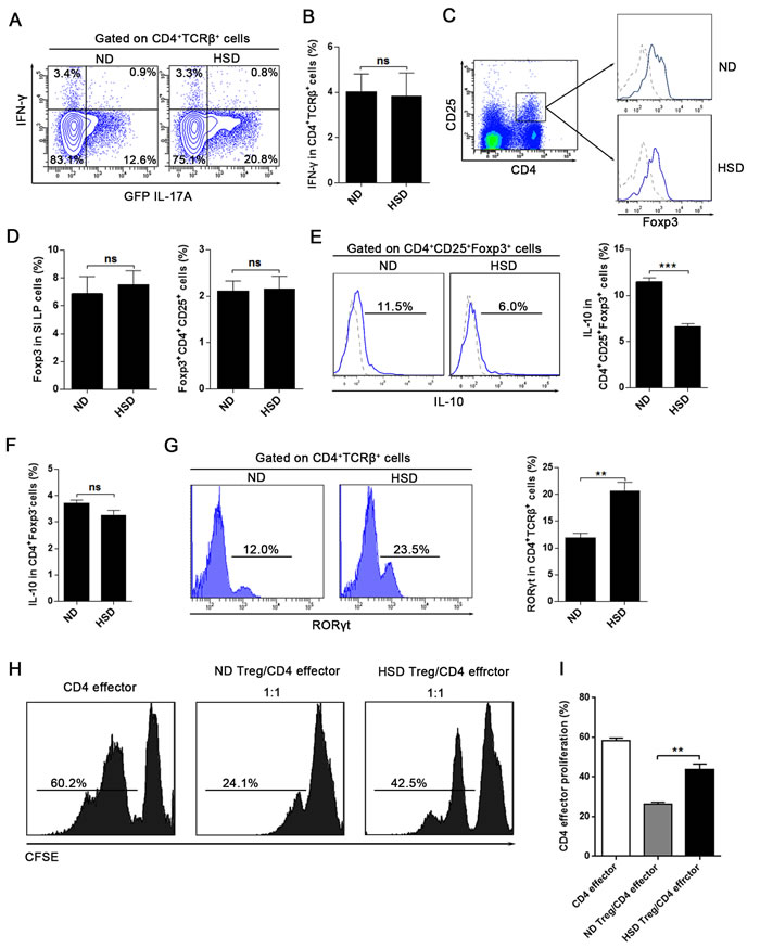 Figure 3: HSD does not alter T helper 1 (Th1) response but impairs the Th17:Treg balance. A. and B. IL-17A-GFP mice were exposed to 3 weeks of ND or HSD before sacrifice, the proportion of IFN-γ+ and GFP IL-17A+ cells within the CD4+TCRβ+ SI LP lymphocytes were analyzed (n = 6), data were acquired by intracellular staining from the SI LP lymphocytes which were incubated for 4 hr with PMA/Ionomycin and GolgiPlug. C.-G. Measurements of the SI LP cells that isolated from the mice on a ND or HSD diet for 3 weeks. C, the flow cytometric gating strategy for CD4+CD25+Foxp3+ Treg cells, the Foxp3 level was analyzed after gated on CD4+CD25+ cells, in the right panel, dash line represent the Foxp3 isotype control and the solid line represent the Foxp3 staining. D, the summative data of the Foxp3 expression and the percentages of CD4+CD25+Foxp3+ Treg cells in the SI LP cells (n = 8). E-F, the IL-10 production of the CD4+CD25+Foxp3+ cells and the CD4+Foxp3- cells, fresh isolated SI LP cells were incubated for 4 hr with PMA/Ionomycin and GolgiPlug before intracellular staining by True-NuclearTM Transcription Factor Buffer Set. G, the RORγt level of the SI LP CD4+TCRβ+ cells (n = 6). H-I, Treg suppression assay, the CD4 effector cells (CD4+CD62L+CD44-) were sorted from mice exposed to 3 weeks of ND, the CD4+CD25+ Treg were sorted from mice exposed to 3 weeks of ND or HSD, CD4 effector cells were labeled with CFSE, stimulated with CD3/CD28 Dynabeads and cultured alone or co-cultured with Treg at ratios as indicated (with IL-2). H. CFSE dilution of CD4 effector cells was measured by flow cytometry after 3.5 days, and CFSE dilution was obtained after gating on CD62L+ cells (CD4 effector cells). I. Summary of the proliferation rate of the CD4 effector cells. Data are expressed as mean ± SEM from three independent experiments.