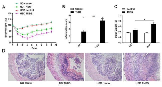 Previous studies have revealed that the incidence of IBD is closely related to dietary habits [21], with high fat intake increasing the risk of IBD, while a high fiber or fruit diet decreases the risk [21]. As the association between a HSD and IBD remains incompletely characterized, we investigate the effects of HSD on intestinal immunity and report the degree of colitis seen in a trinitrobenzenesulfonic acid (TNBS)-induced mouse model of IBD.