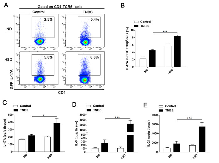 Figure 5: Th17 response was stimulated in acute TNBS-induced colitis of mice fed a HSD. A. and B. the proportion of GFP IL-17A+ cells within the CD4+TCRβ+ LI LP lymphocytes. Cells were isolated from specified diet IL-17A-GFP mice 3 days after colitis induction and incubated for 4 hr with PMA/Ionomycin and GolgiPlug (n = 8). C., D. and E. ELISA analysis of the colonic IL-17A (C), IL-6 (D) and IL-21 (E) of ND or HSD colitis-induced mice, colonic tissues were sampled from specified diet mice 3 days following induction of colitis (n = 8). Data are expressed as mean ± SEM from three independent experiments.