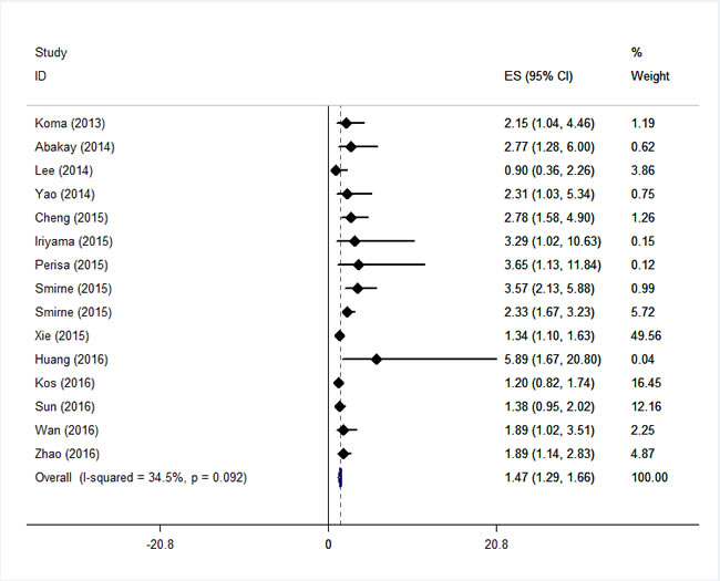 As shown in Figure 1, a total of 350 articles meeting our included criteria were initially collected through our search strategy. After removed duplicate and irrelevant papers, a total of 16 articles were included in this analysis. For case ascertainment, fifteen articles [13-27] performed retrospective analysis (3953 participants), and one article [28] had both a retrospective design and a prospectively design in two independent patients population (314 participants). Therefore, a total of 16 articles including 17 studies with 4267 patients were included in this analysis with a median sample size of 179 (from 81 to 938). One study used RDW-SD for RDW [17] and others used RDW-CV. All studies were published between 2013 and 2016 in English peer-reviewed journals. These studies were from China, Japan, Italy, Korea, America, Turkey and Croatia, which evaluated various type of cancers, including four for esophageal cancer, three for lung cancer, two for hepatocellular carcinoma, two for breast cancer, one for multiple myeloma, one for diffuse large B-cell lymphoma, one for chronic myeloid leukemia, one for malignant mesothelioma, and one for upper tract urothelial Carcinoma.
