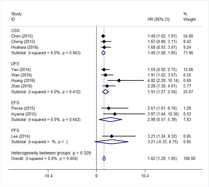 Figure 3: Forest plot for the association between RDW and the CSS, DFS, EFS and PFS of patients with cancer.